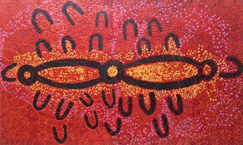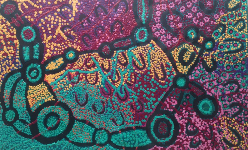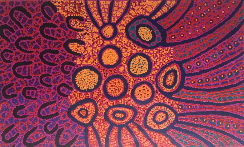 Jessie was brought up around well-known artists such as Turkey Tolson, Uta Uta Tjangala, Ronnie Tjampitjinpa, Mick Namararai Tjapaltjarri, Johnny Yungut Tjupurrula (her grandfather’s brother) and Pinta Pinta (her grandmother’s brother), who were part of the emerging Western Desert art movement. Jessie witnessed and was influenced by the great works of these artists. It was these early leaders that gave her a rare insight into the cultural perspectives of Pintupi people.