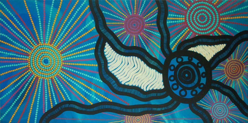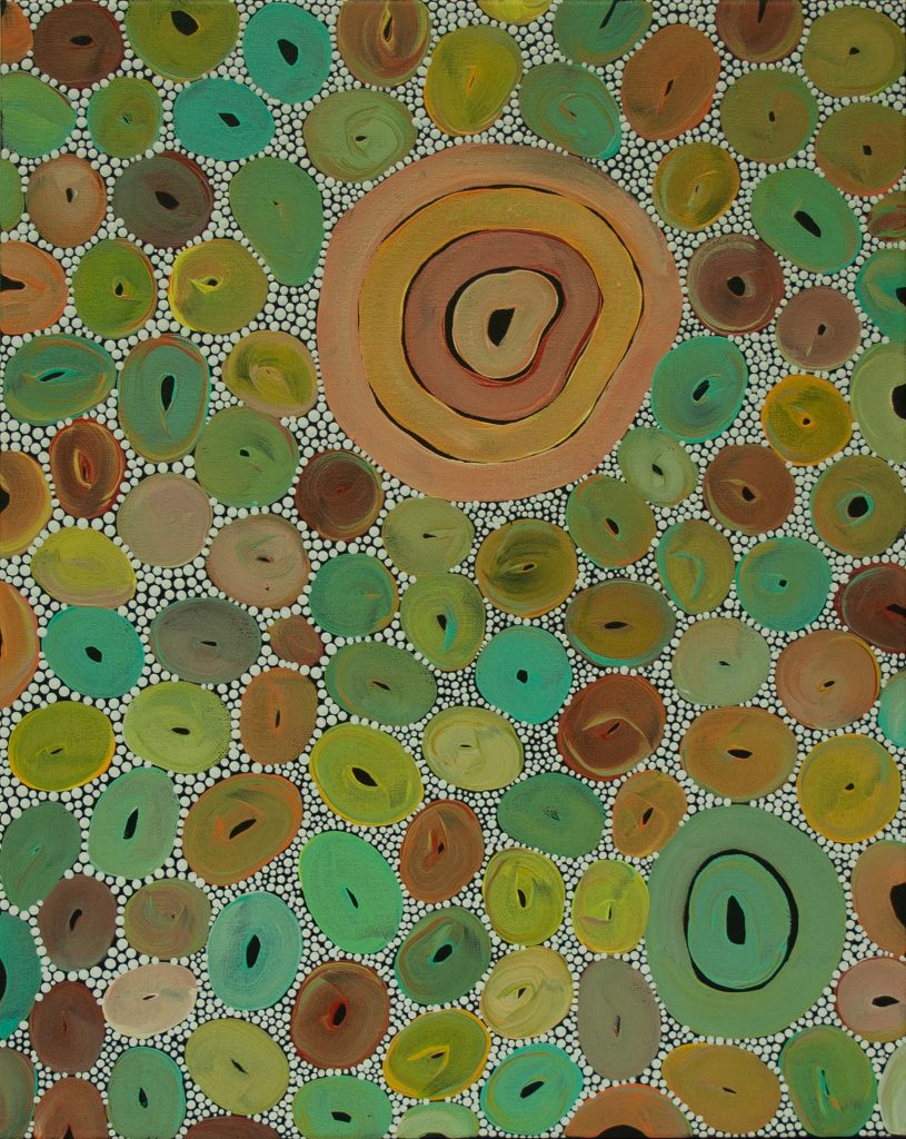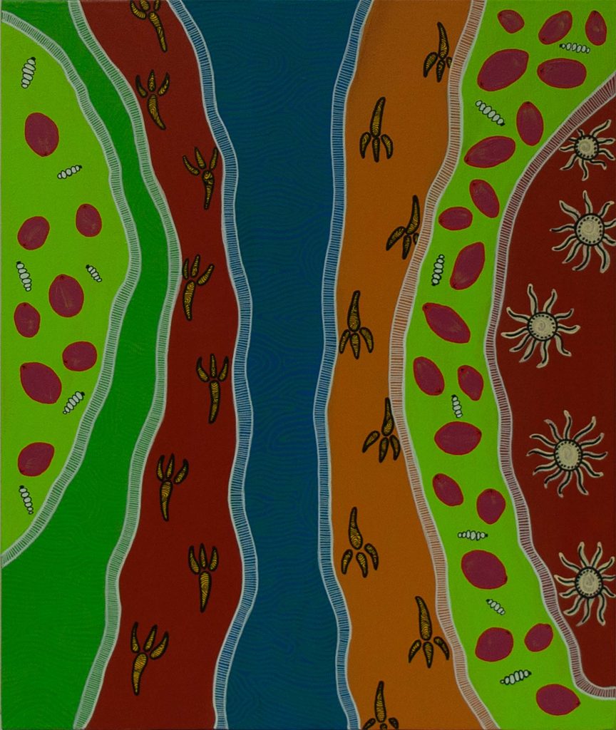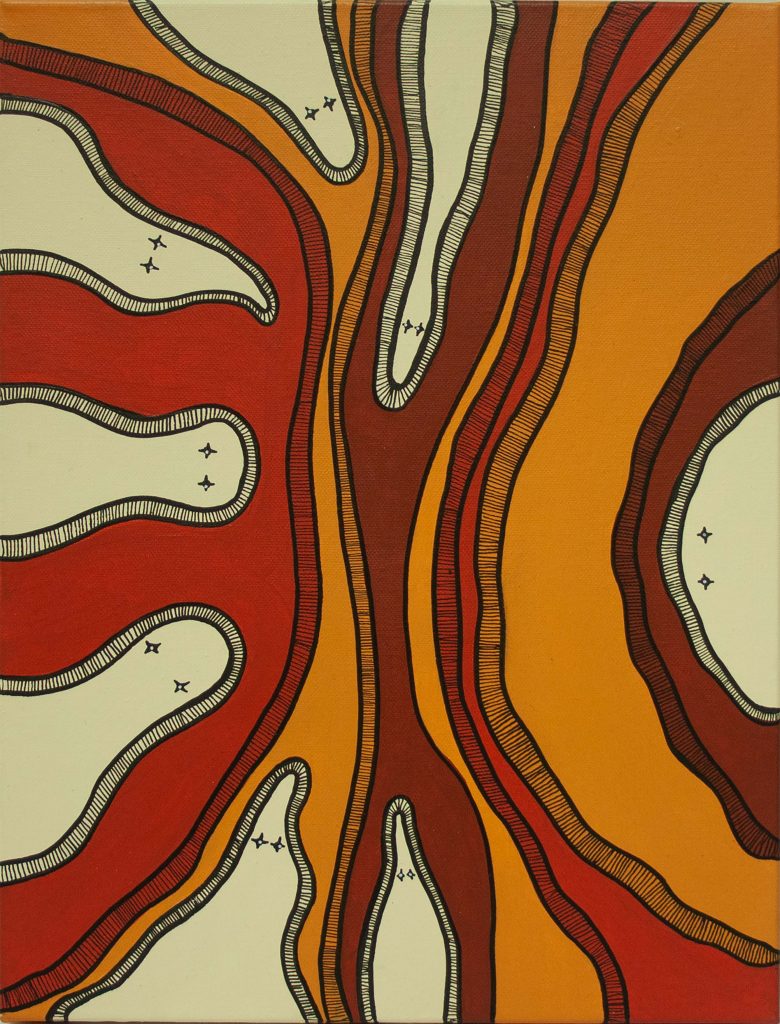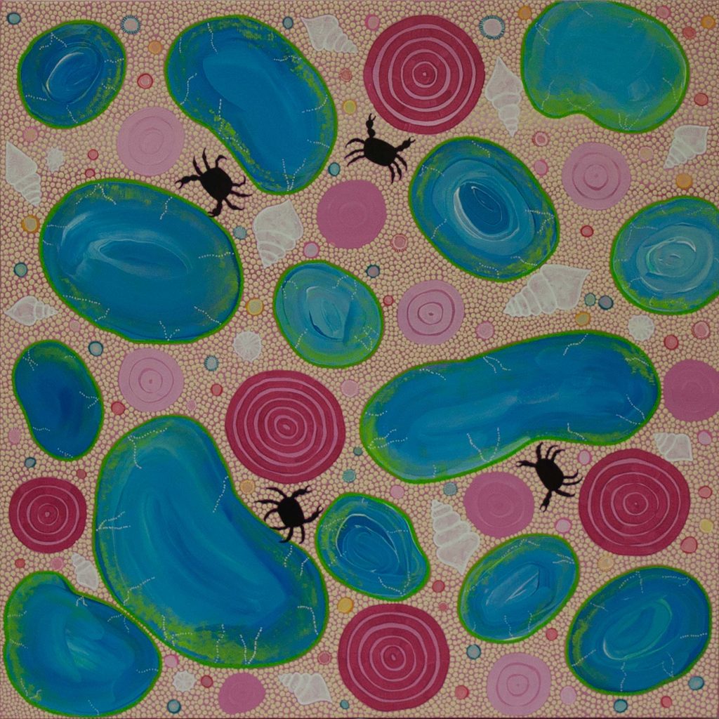 I am originally from Grafton NSW in Bundjalung Country from Baryulgil. I moved to the Gold Coast when I was 2 years old. My art is based around country and family. The Northern Rivers country has the most beautiful landscape in Australia, the terraces, rivers, and beaches, all these areas hold a lot of stories and scaredness. I am proud of the country I was born on and that it holds so much story everywhere you look. I try to stay connected to home as much as I can being quite far from it, painting helps me stay connected.